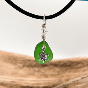 Sea Glass Pendant - Vibrant Green with Turtle Charm